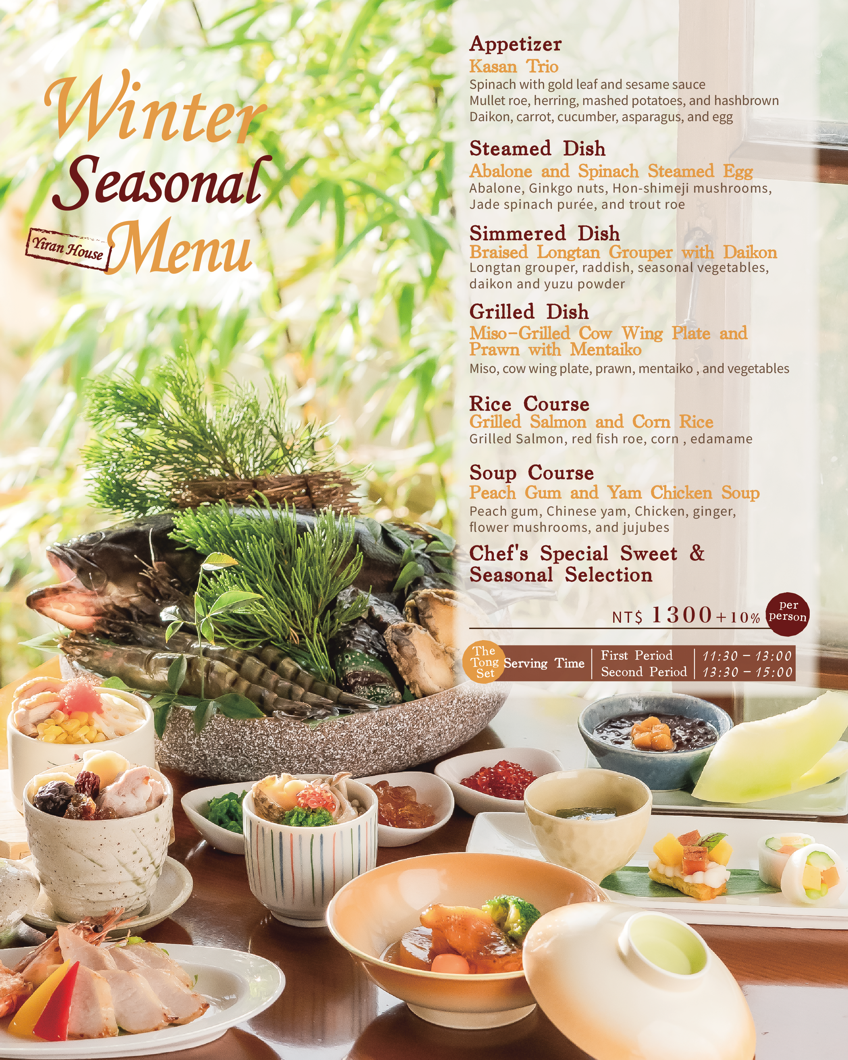 Beitou 北投文物館Food and Cuisine-The Menu-The Menu-Lunch-Afternoon teaReservationThe Customized ProjectsThe Environments-The Yiran House-The Grand Room-Guanyin Terrace Food and CuisineCategory The Menu-Lunch-Afternoon teaReservationThe Customized ProjectsThe Environments-The Yiran House-The Grand Room-Guanyin TerraceLunch ※ Vegetarian set menu available upon request. Please indicate your preference when making a reservation. ※ Children's meal NT$600+10%, includes 5 courses, dessert, and fresh fruit.Back