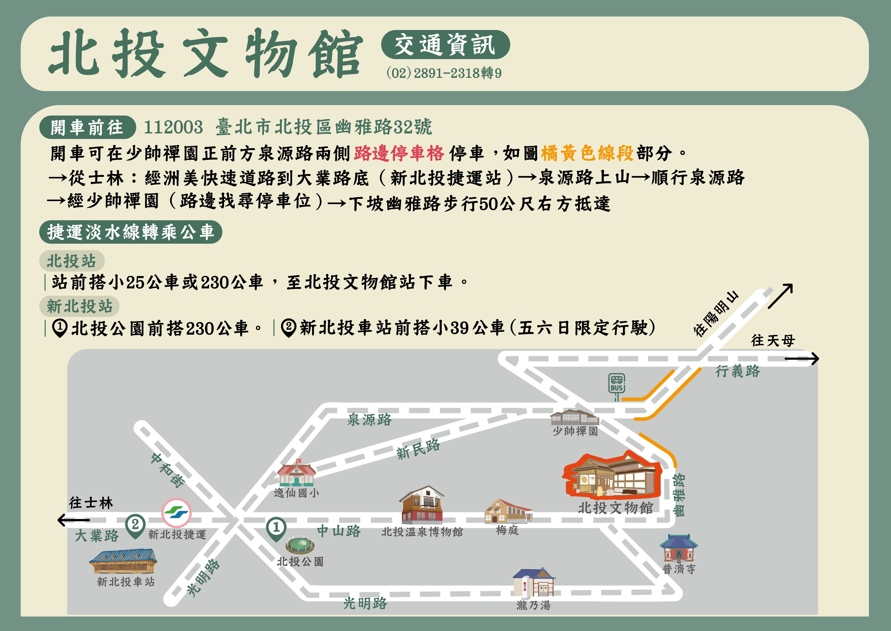 新北投站 | 光明派出所前搭230公車,至「北投文物館站」下車。