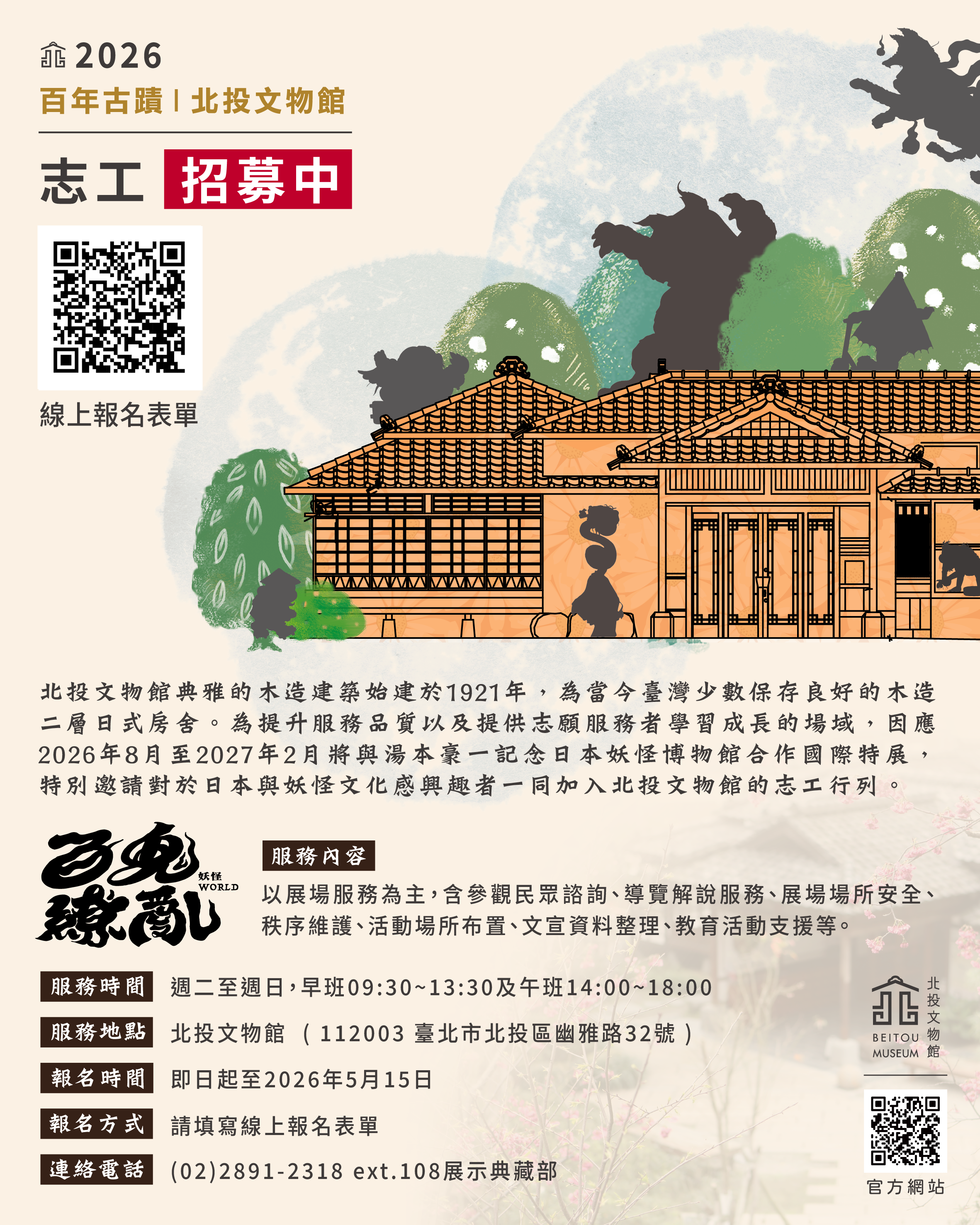 北投文物館將於 2026年8月至2027年2月,與「湯本豪一記念日本妖怪博物館」合作舉辦國際特展 。為提供優質的參觀體驗,我們特別邀請對日本與妖怪文化感興趣的夥伴,一同加入北投文物館的志工行列 !